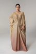 The enchanting allure of Twilight with the exquisite Moonlight Shimmer Kaftan, beautifully made from luxurious blend of gold and pink. The ethereal tones creates a mesmerising ombre’ effect. Elegantly draped from both front and back.