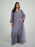 A soft lavender formal wear with intricate multicolor thread embroidery, blending tradition with modern grace. The look is completed with a soft organza dupatta and flowy trousers, making it ideal for day or evening wear.